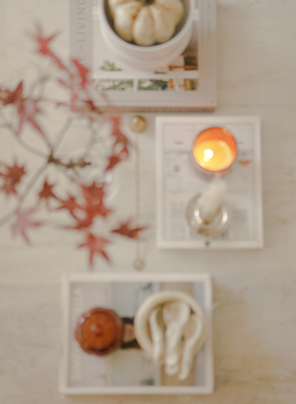 There’s a copy of Simply Nigella, because nothing says autumn like a roasted onion and goat cheese galette. A little amber jar candle flickers next to it. An imperfect ceramic dish and spoon sits atop a worn book. There’s no symmetry. No grand gesture. And yet, it feels whole.