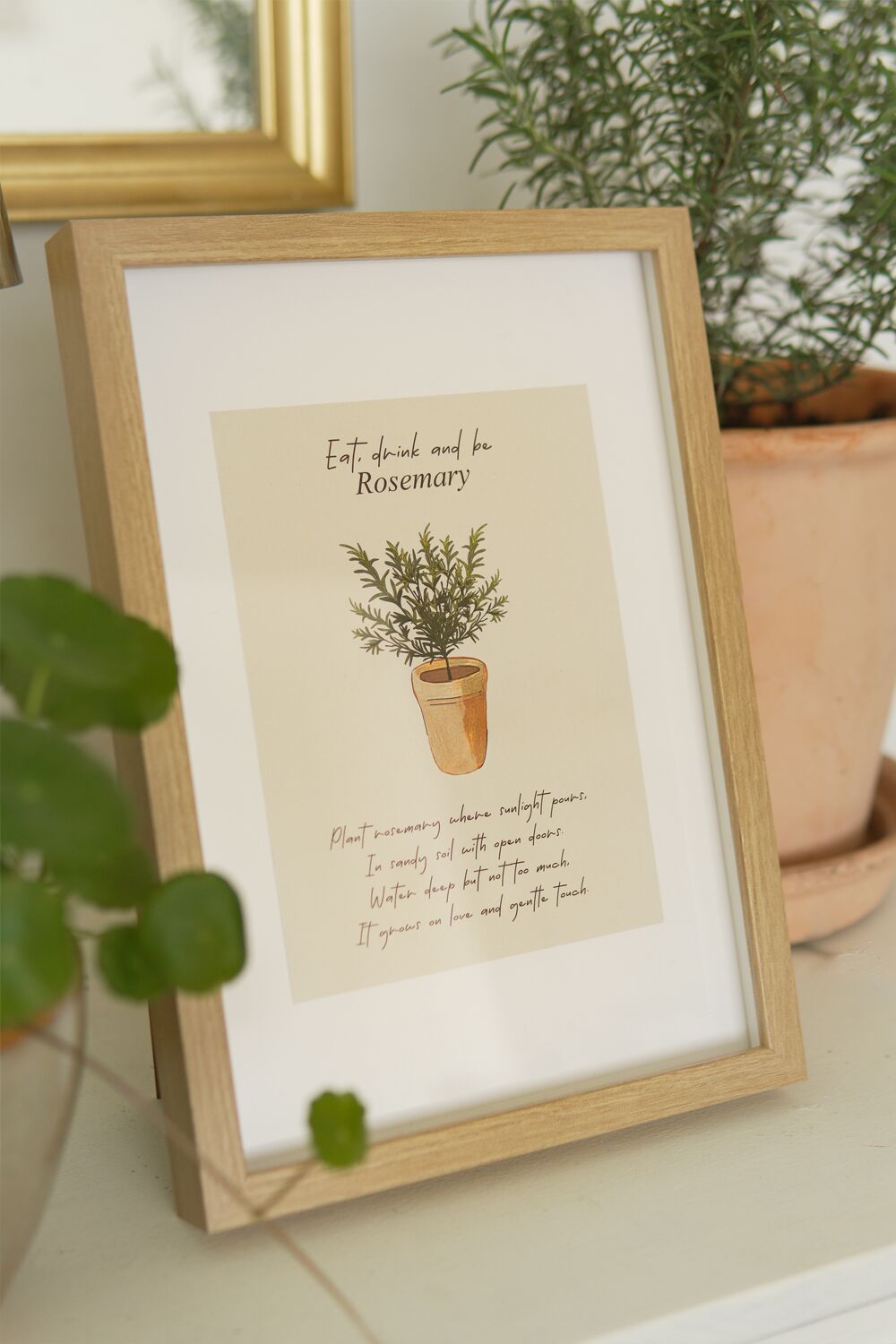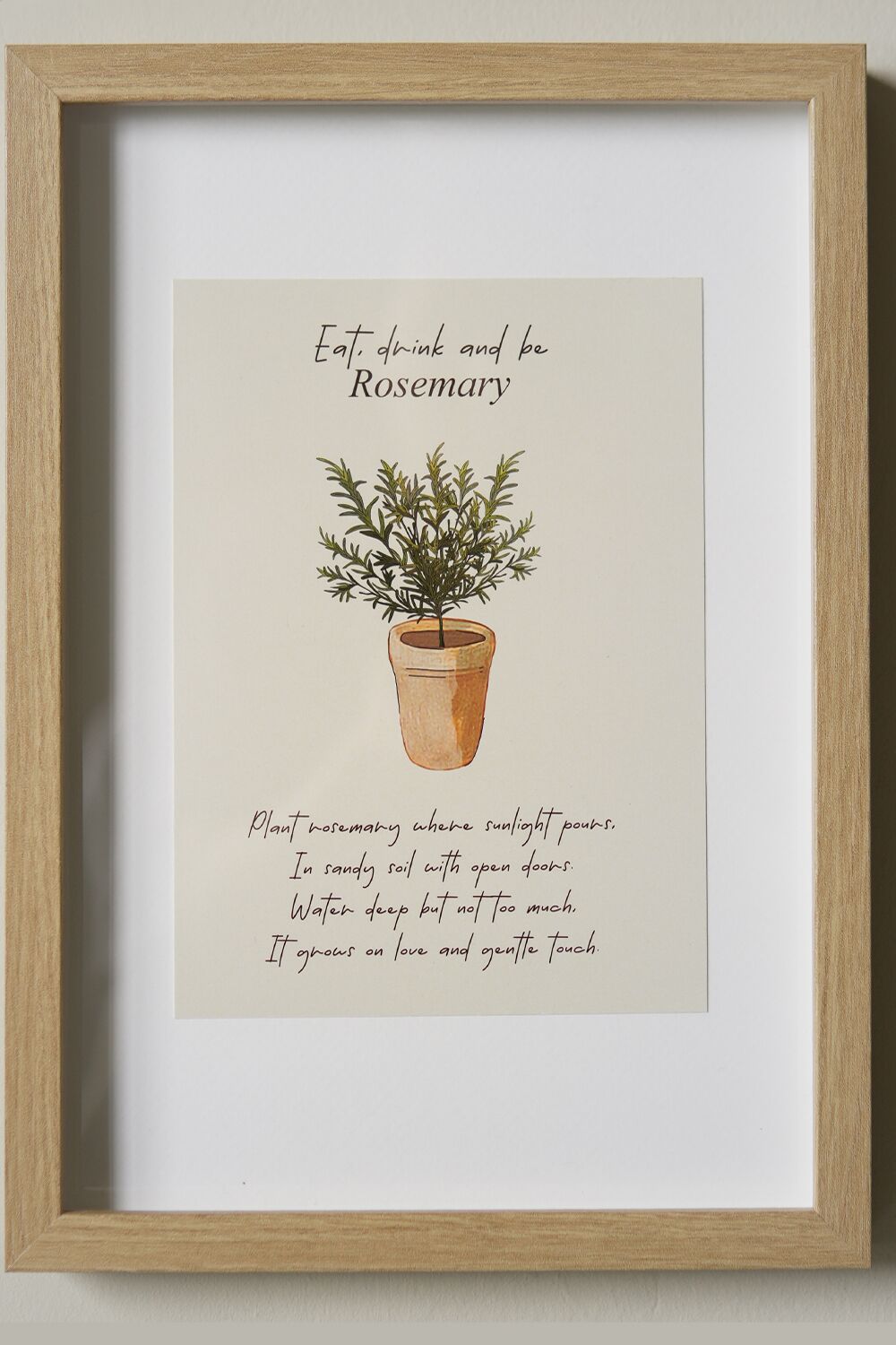 Infuse your home with charm with our ‘Eat, Drink, and Be Rosemary’ art print. This beautiful country-style illustration of a rosemary plant adds a touch of rustic elegance to any kitchen or dining space. Perfect for botanical wall art or as a unique gift.
