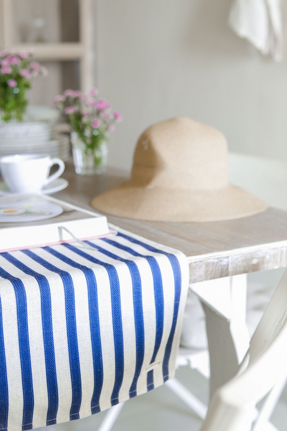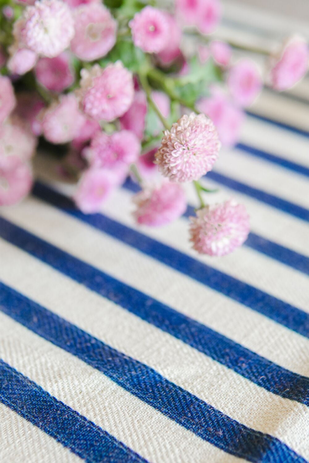 Timeless blue stripes woven in a distinctive herringbone pattern alternate with oatmeal. While the subtle texture of the herringbone weave adds visual interest, a splash of blue and white sets the mood for a long-awaited summer party by the beach.