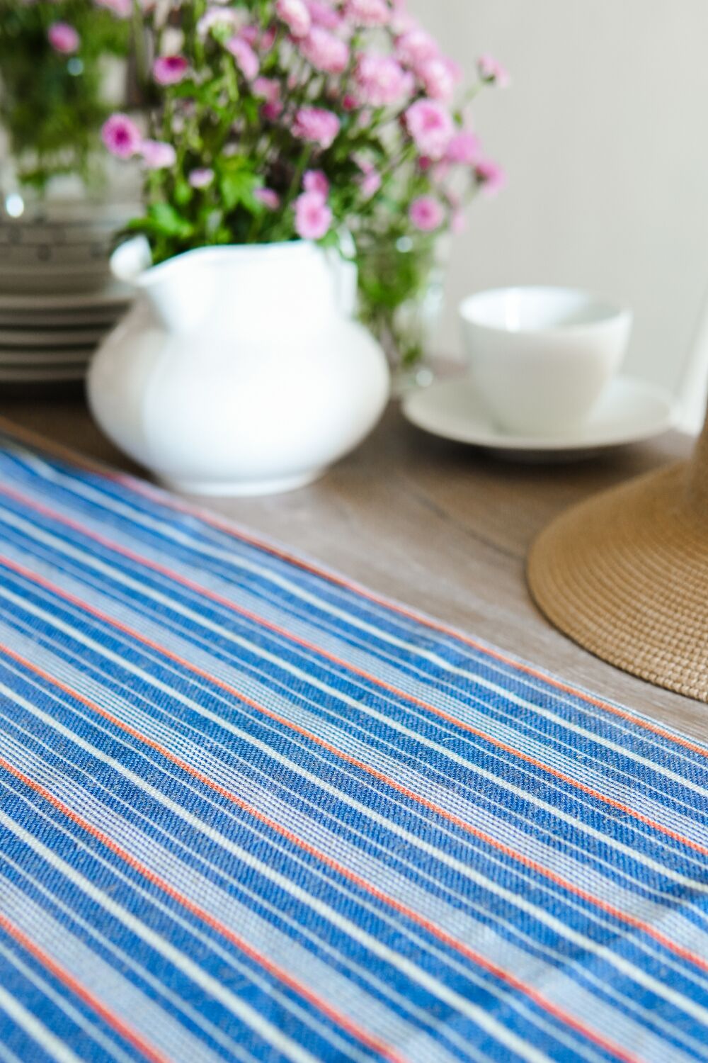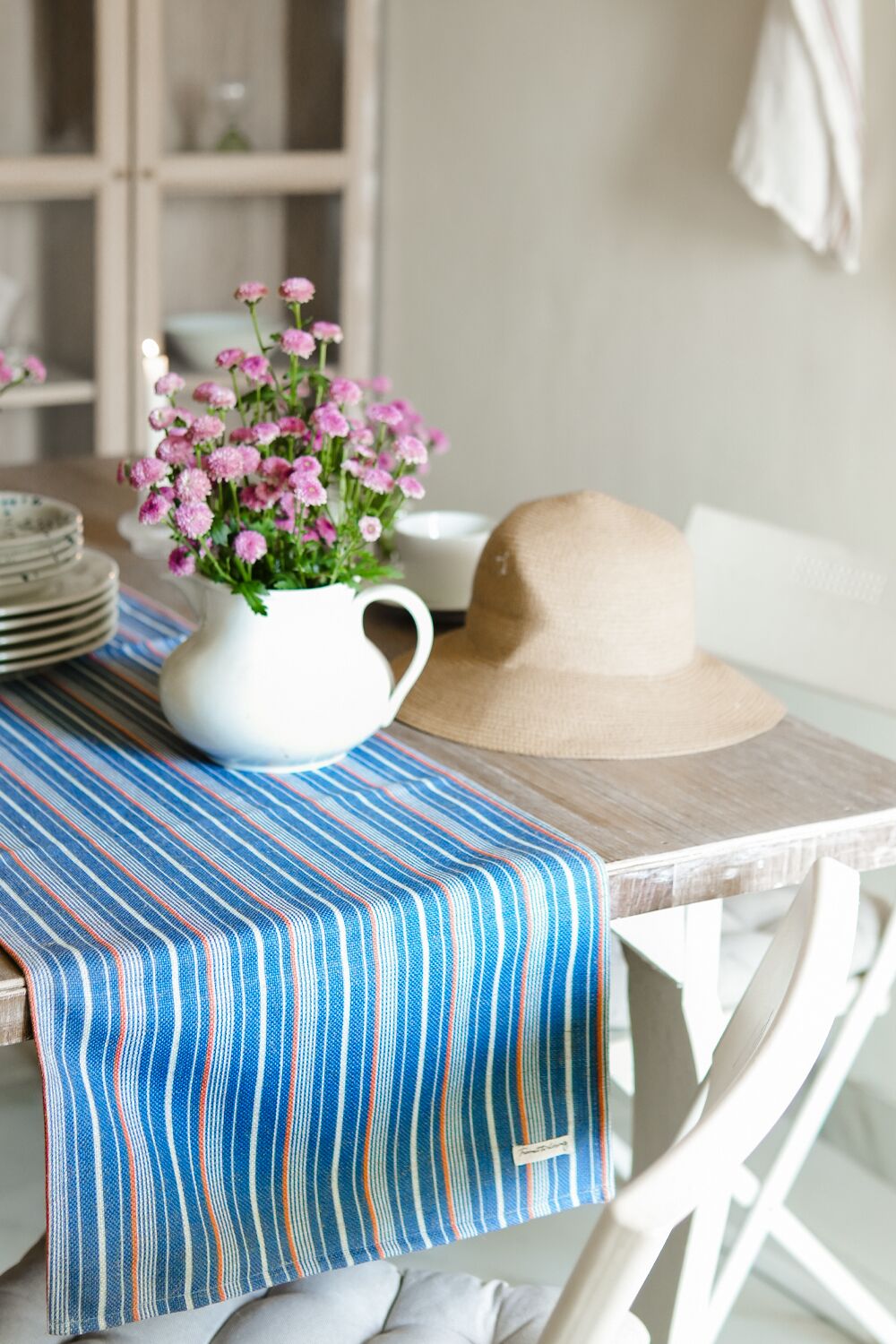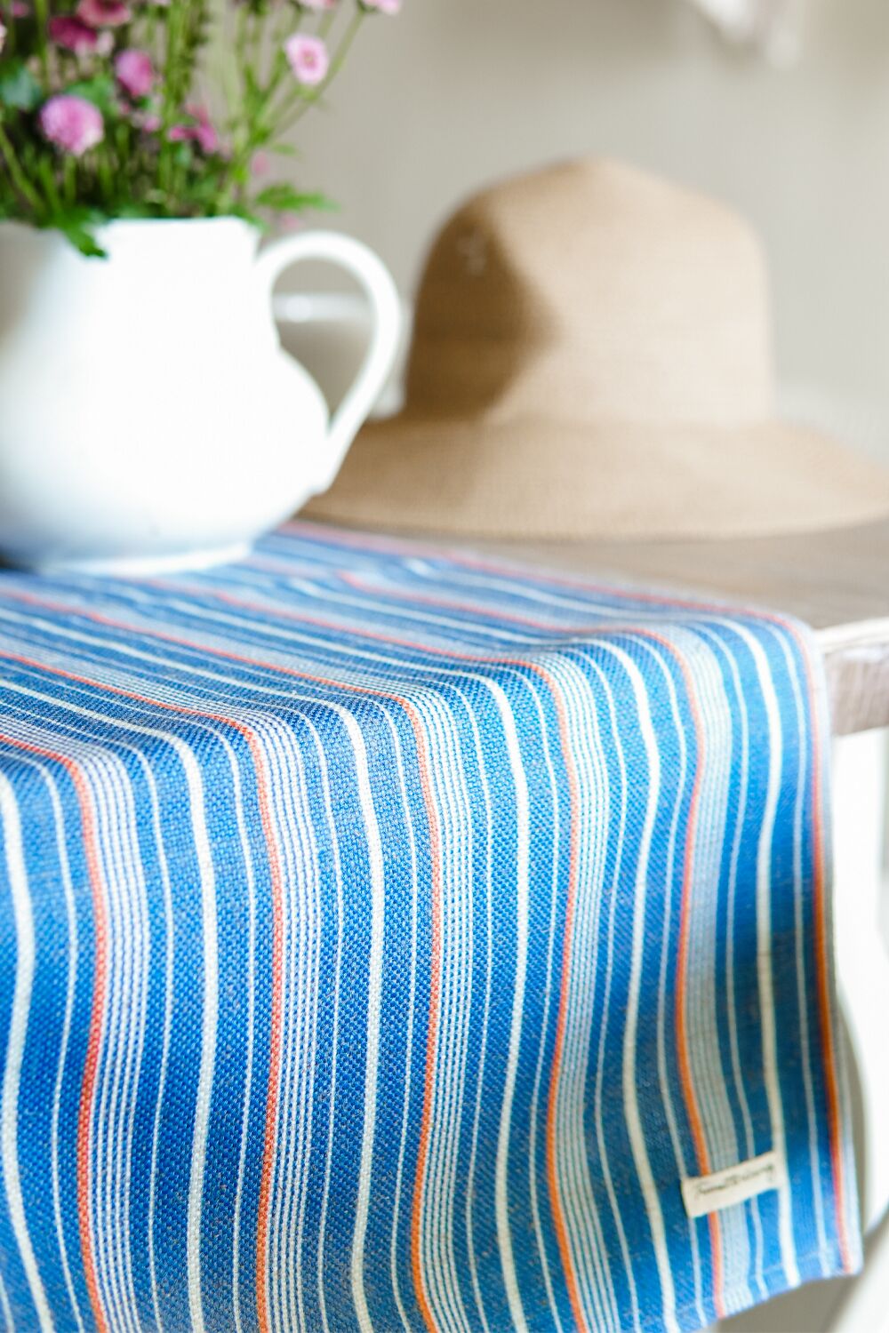 We got the July sky for you! Our July Stripes table runner features a vibrant blue base accented with crisp white stripes and cheerful orange lines reminiscent of clear blue summer skies meeting beautiful sunset hues. It cannot get more summer than this!