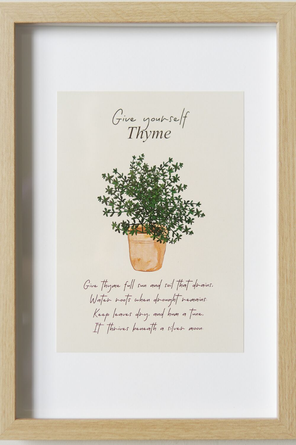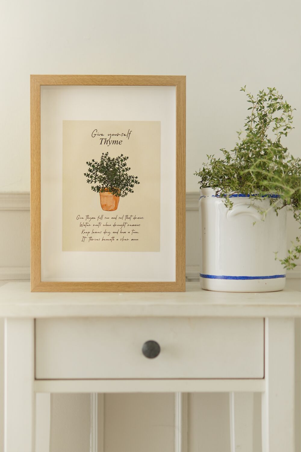 Slow down and ‘Give Yourself Thyme’ with this tranquil art print. This beautiful country-style illustration of a thyme plant brings a sense of calm and natural beauty to your space. Perfect for kitchen wall art, meditation corners, or as a gentle reminder.