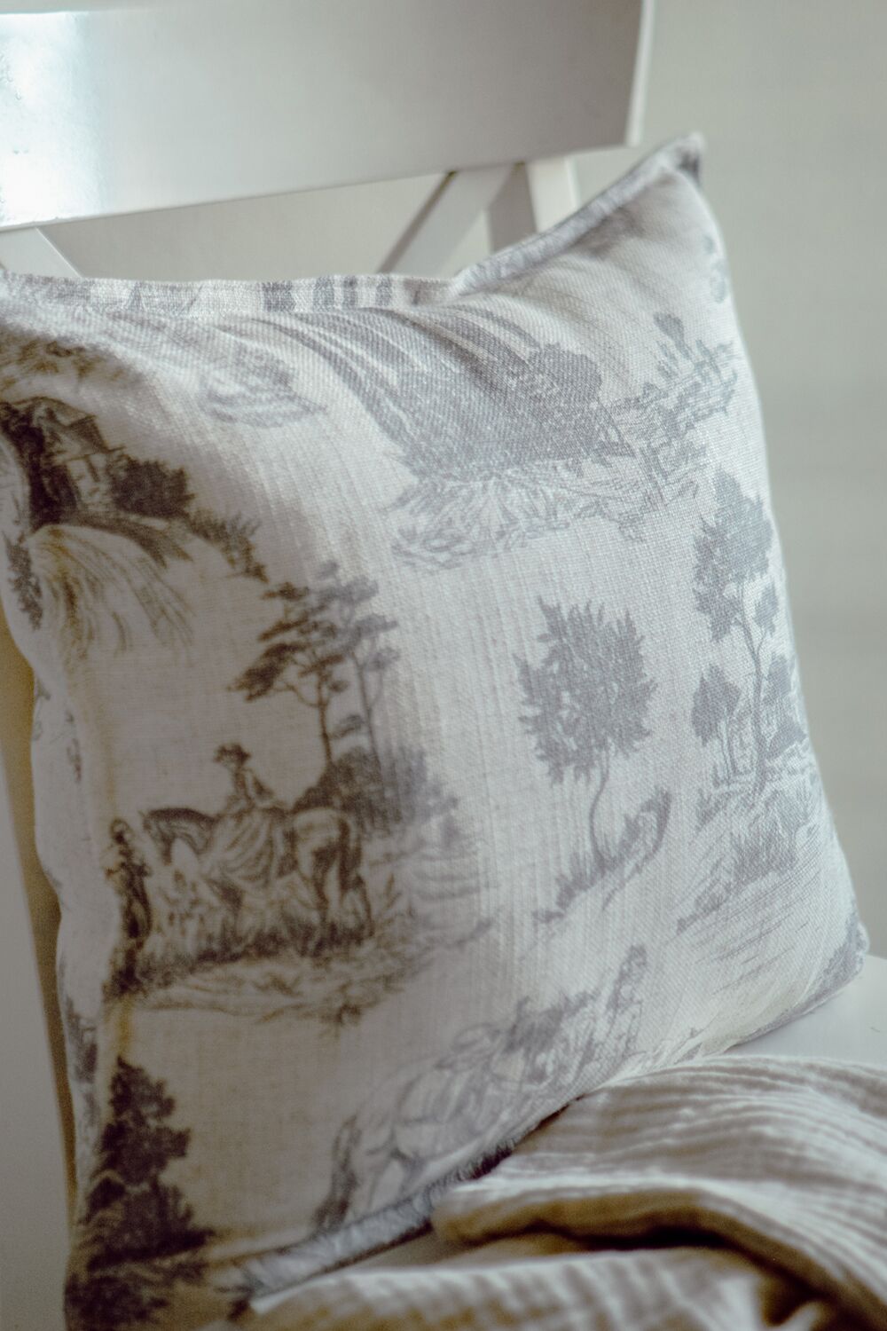 Settle in and savor the treat that this Toile de Jouy cushion cover is. Printed on a soft, thick linen blend, our Toile in Grey is what you want when you crave pure elegance.